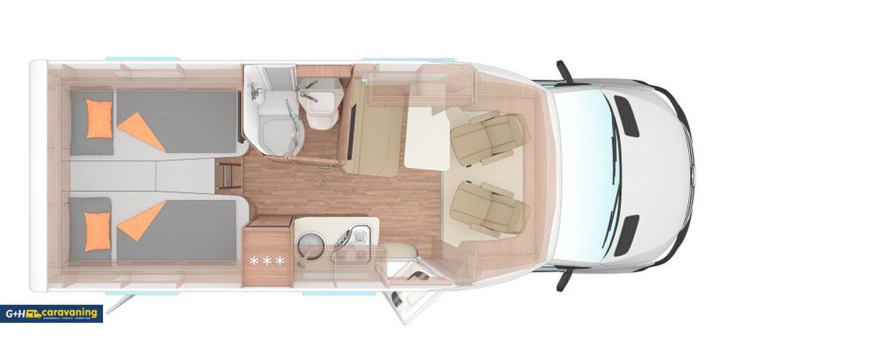 Im Innenraum erwarten dich zwei komfortable Einzelbetten, die sich zu einer großen Liegefläche verbinden lassen, sowie eine Küche mit großem Kühlschrank und ein funktionales Bad mit Dusche/WC.